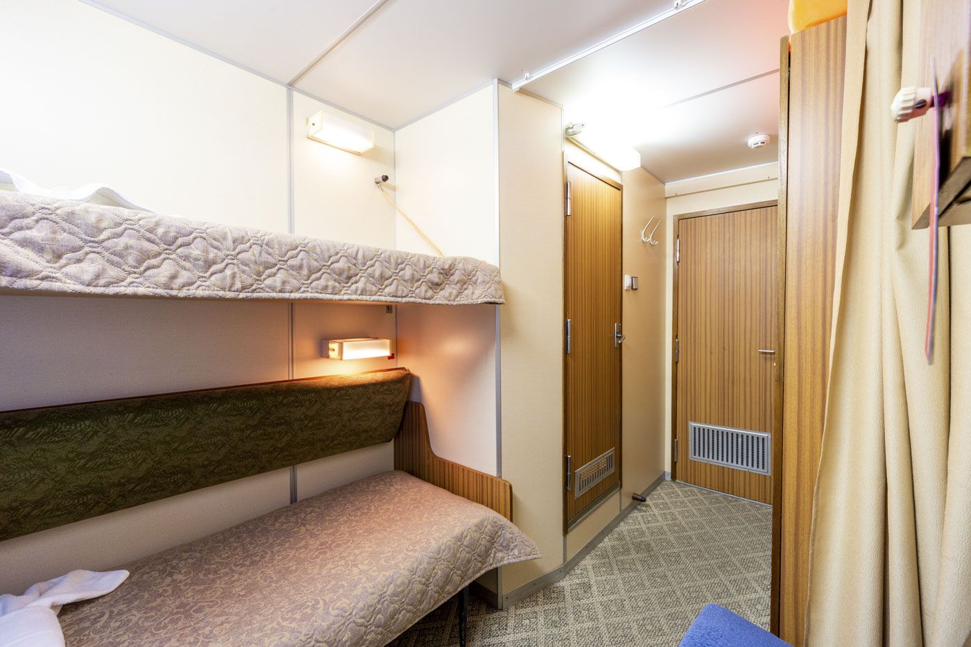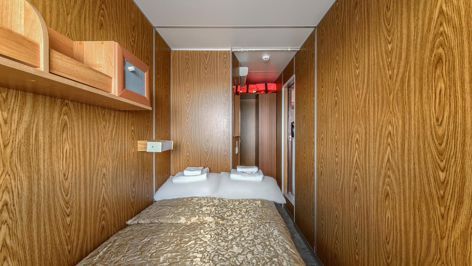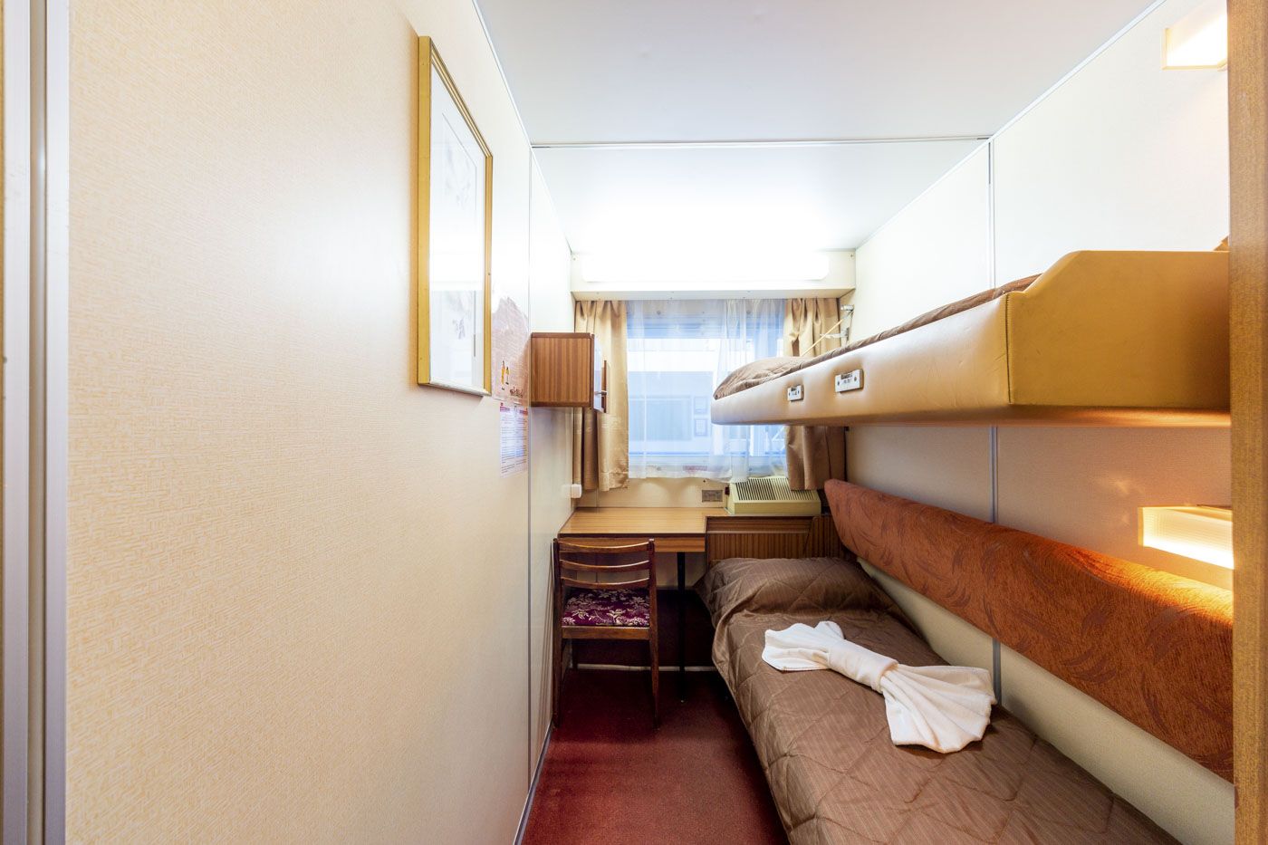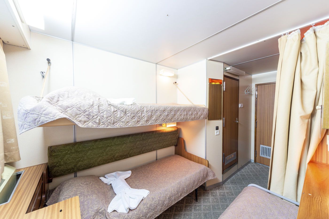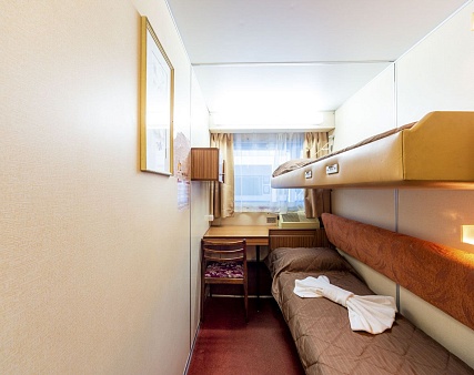 В каюте: два спальных места (одно над другим), шкаф для одежды, зеркало, радио, душ, санузел, кондиционер, обзорное окно, электророзетка на 220V.