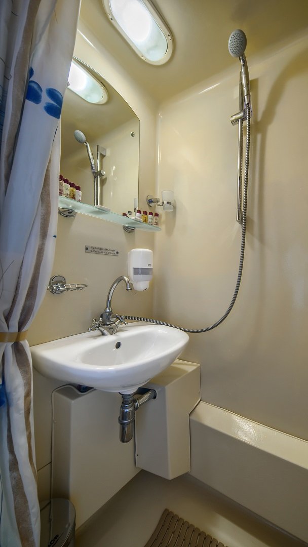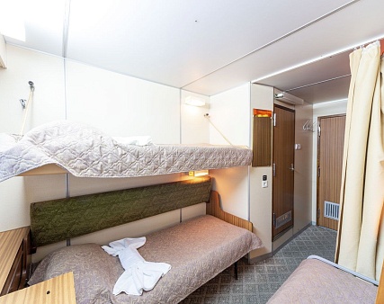 В каюте: три спальных места (два внизу, одно вторым ярусом), шкаф для одежды, трюмо, радио, душ, санузел, кондиционер, обзорное окно, электророзетка на 220V.