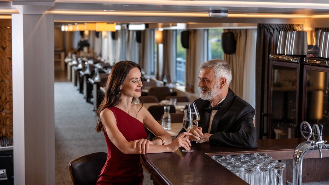 - Ужин — заказная система питания (выбор блюд со 2-го дня круиза). Включённые напитки (без ограничения): вода, чай, кофе, кисломолочный напиток (1 стакан 200 мл на ужин по запросу гостя). На выбор: вино красное / белое / игристое (1 бокал, 125 мл) / водка (1 рюмка, 50 мл) / пиво (1 бокал, 300 мл), домашний морс (1 бокал, 200 мл);