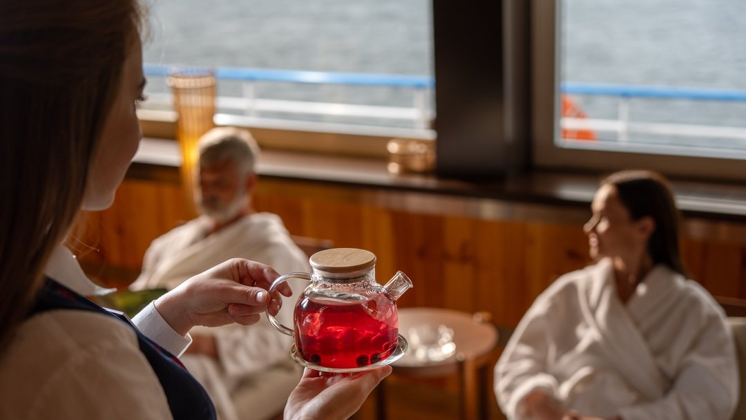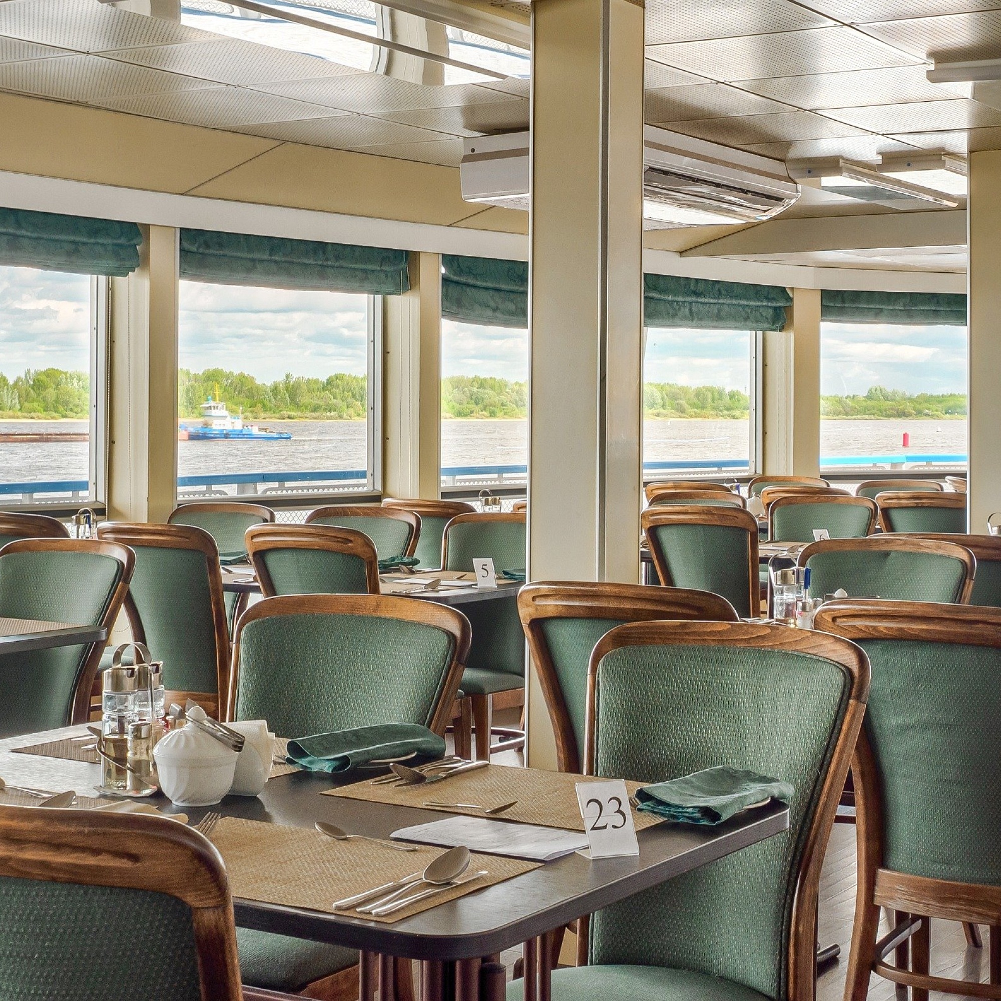 - Обед — заказная система питания (выбор блюд со 2-го дня круиза), фиксированная рассадка. Включённые напитки (без ограничения): вода, чай, кофе, морс;