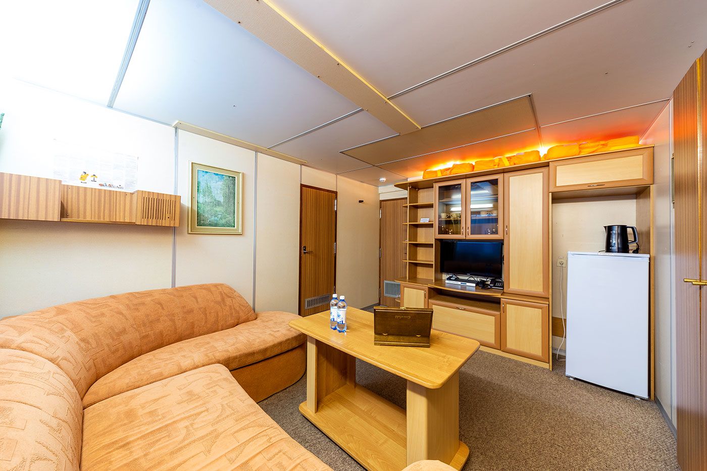 - Каюты класса «Люкс» и «Евролюкс»: бутилированная вода в каюте (ежедневное пополнение) — 1 бутылка (0,5 л.) на человека в день;