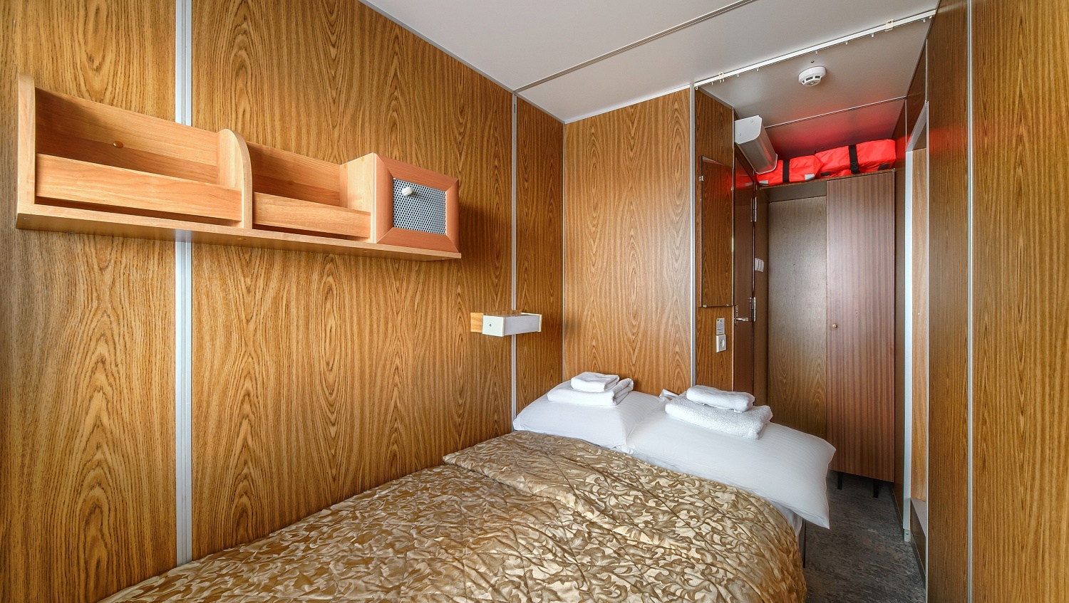 В спальне: двуспальная кровать, шкаф для одежды, радио, обзорное окно, электророзетка на 220V.