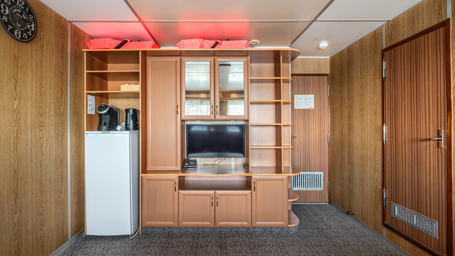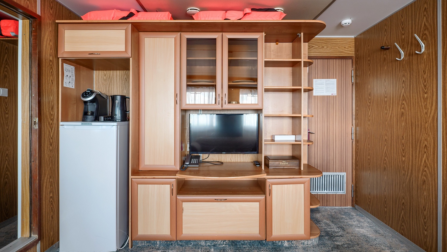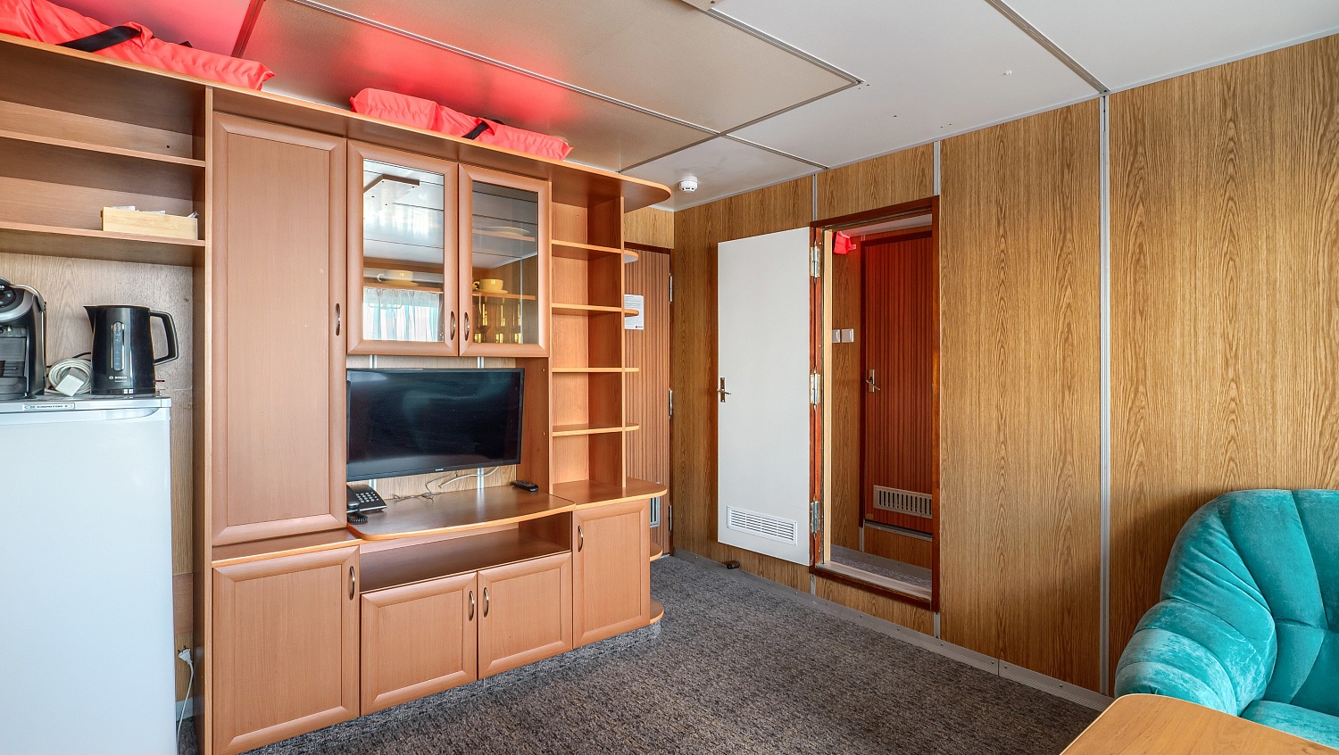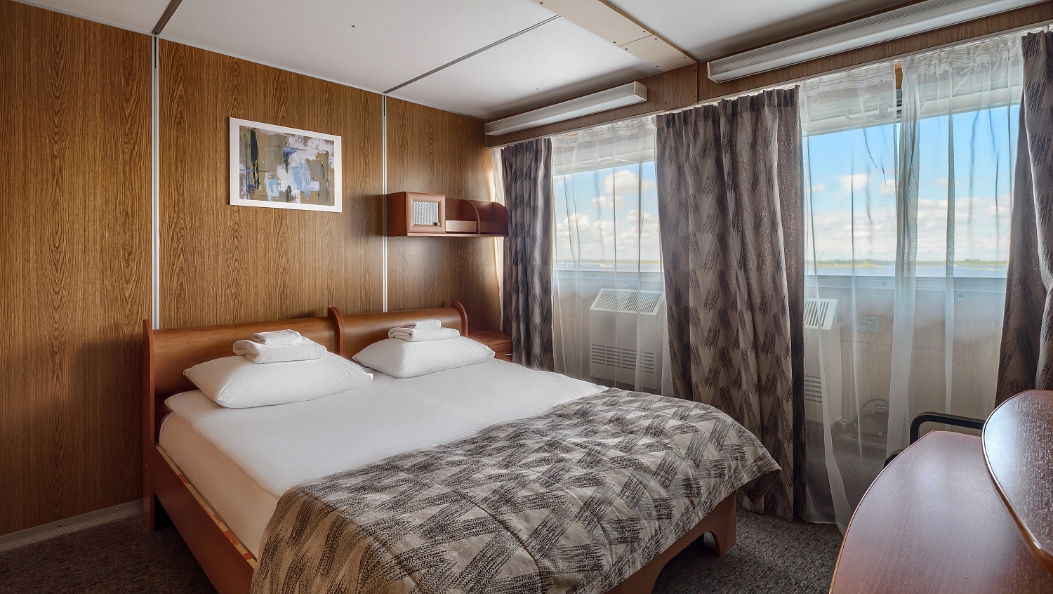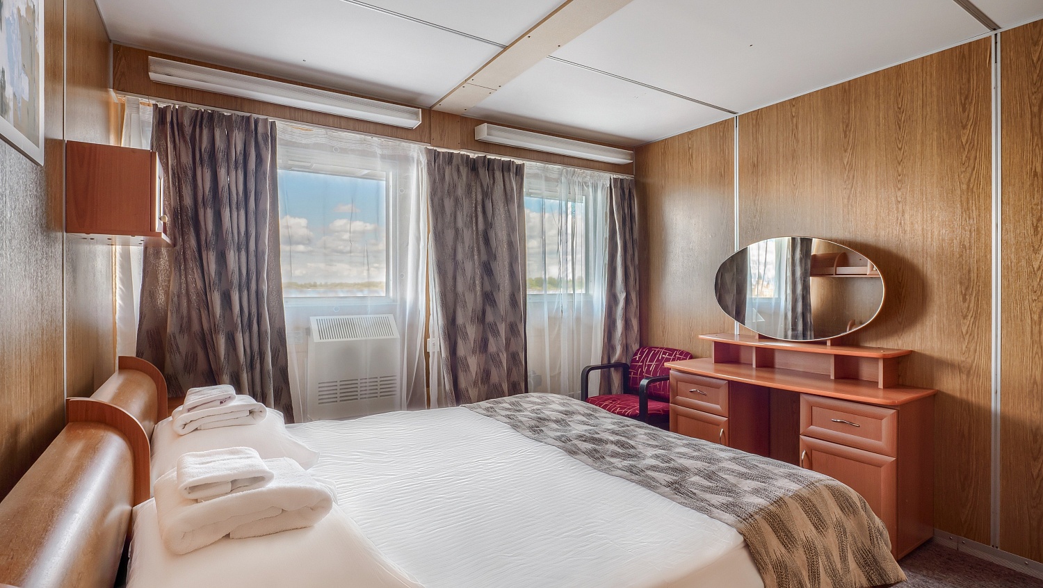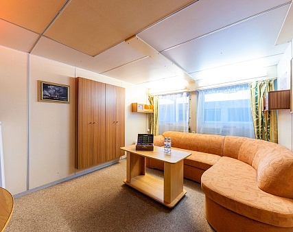 В каюте: два спальных места, шкаф для одежды, зеркало, радио, душ, санузел, кондиционер, обзорное окно, электророзетка на 220V.