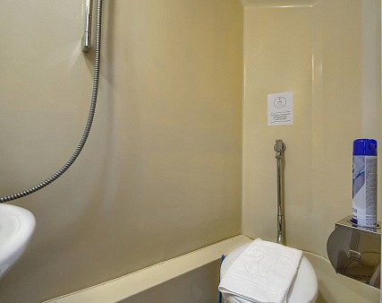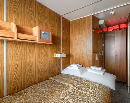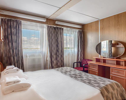 В каюте: одно спальное место, шкаф для одежды, зеркало, радио, душ, санузел, кондиционер, обзорное окно, электророзетка на 220V.