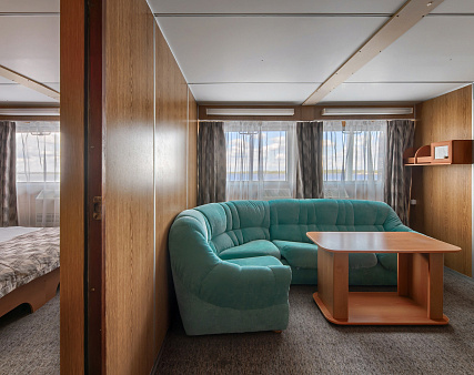 Площадь каюты 28 м2 (спальня — 14 м2, гостиная — 14 м2).