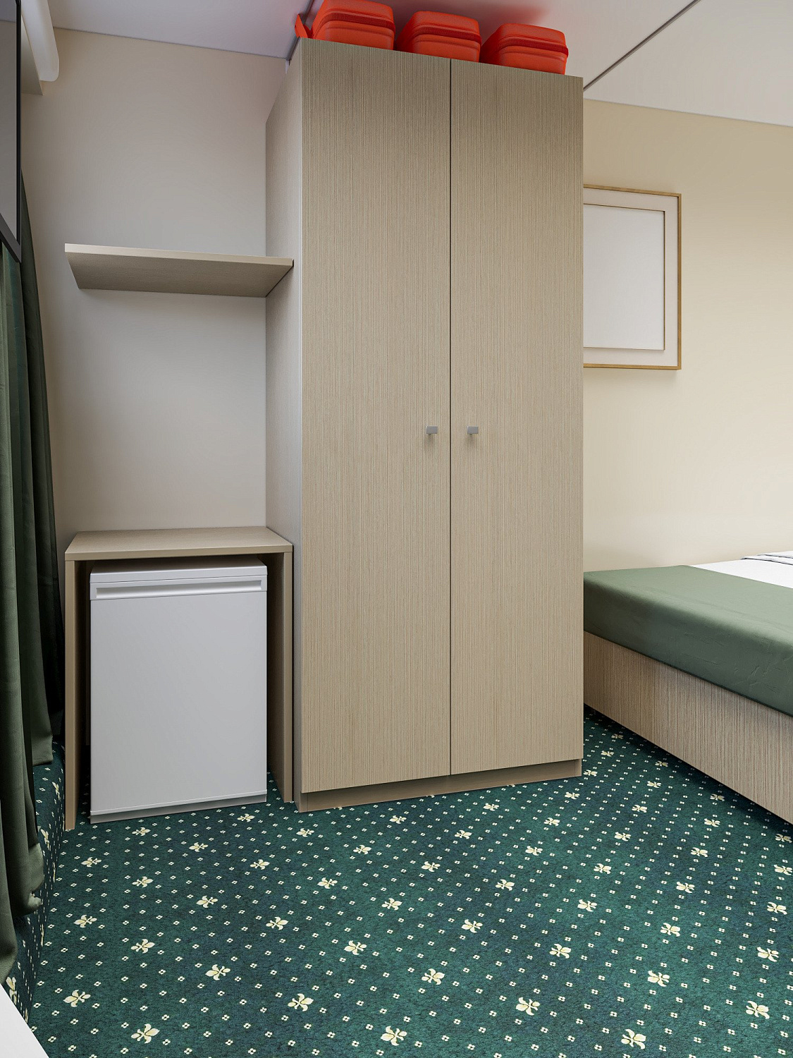 Во второй комнате: одно (номера кают: 7, 8) или два — одно над другим (номера кают: 124, 125) спальных места, шкаф для одежды, обзорное окно.