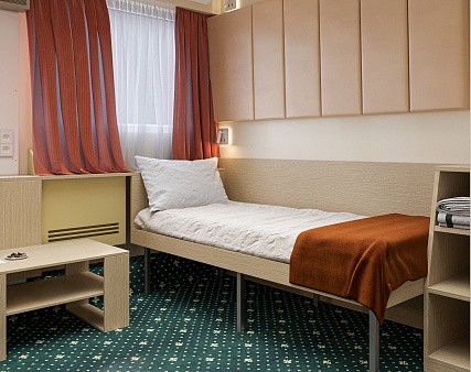 В каюте: односпальная кровать, диван, раскладывающийся на двух человек, шкаф для одежды, журнальный столик,телевизор с DVD, кондиционер, холодильник, радио, два обзорных окна, электророзетка на 220V.