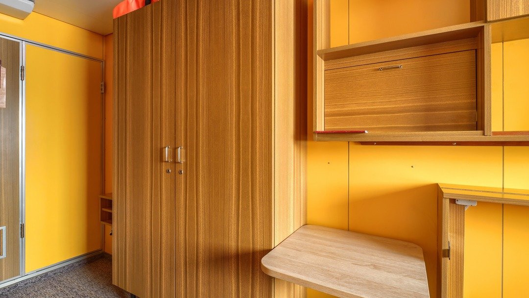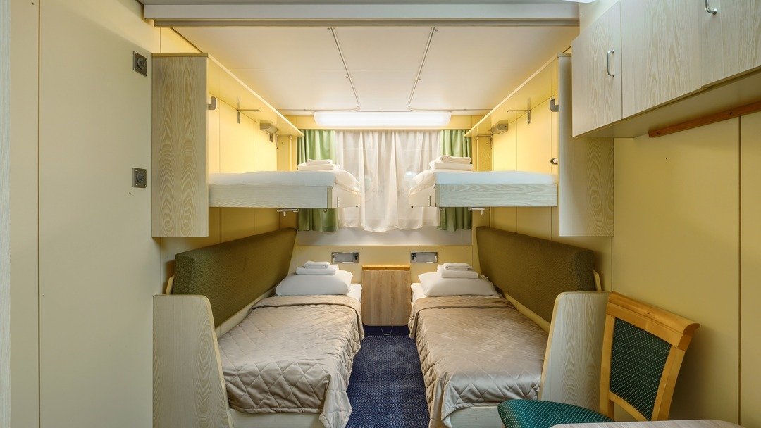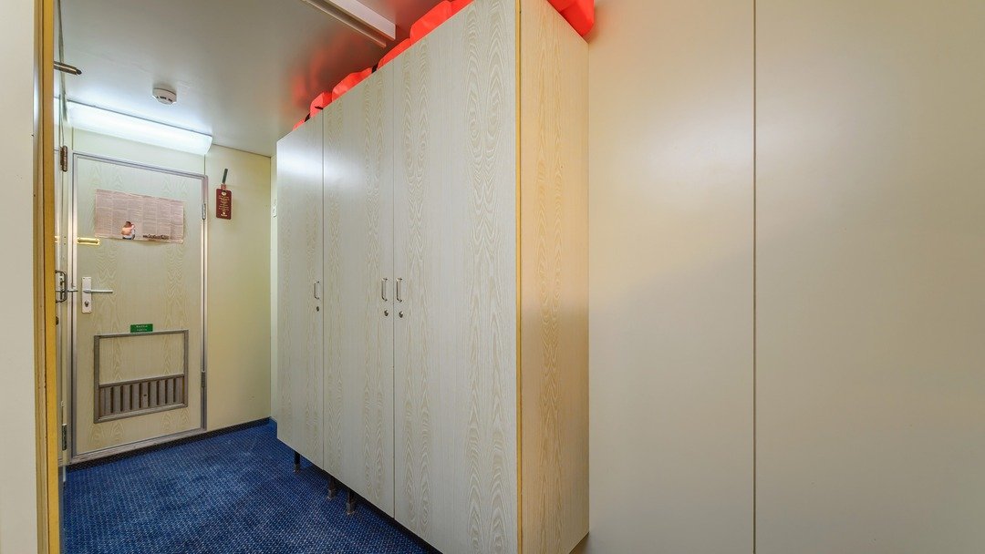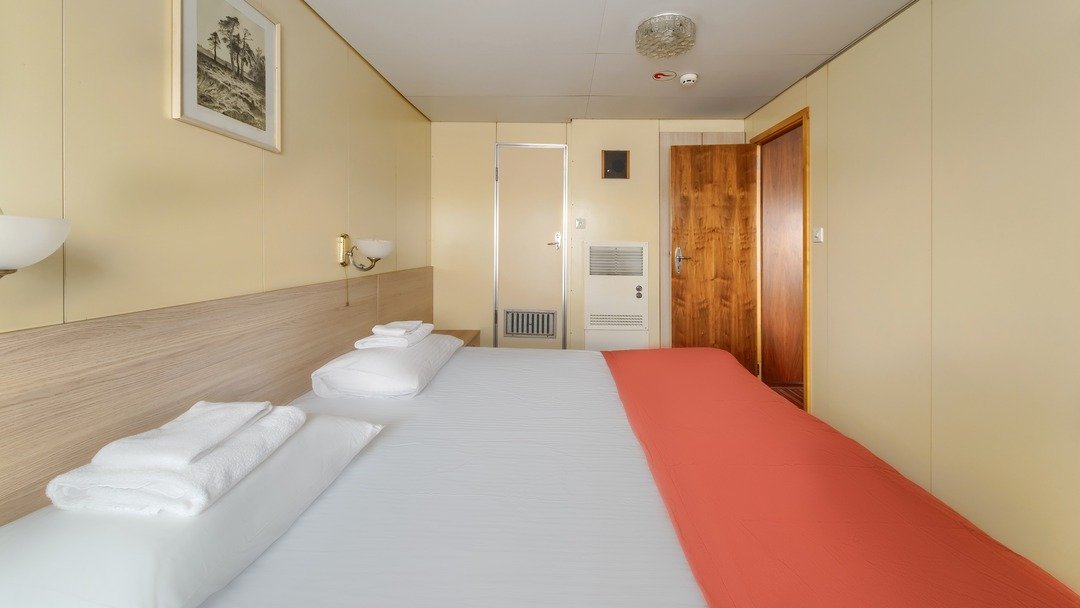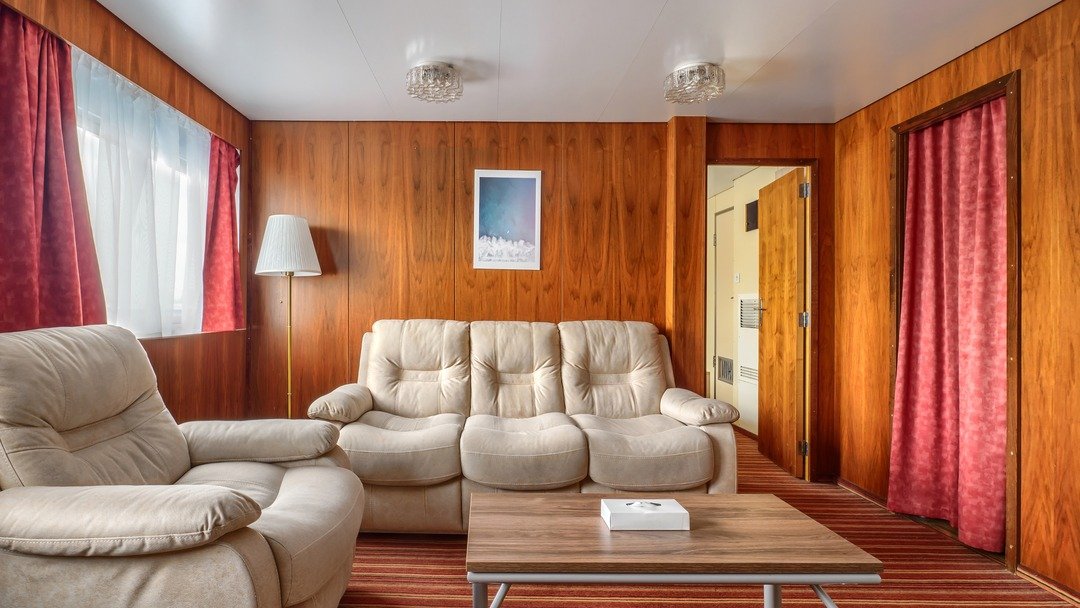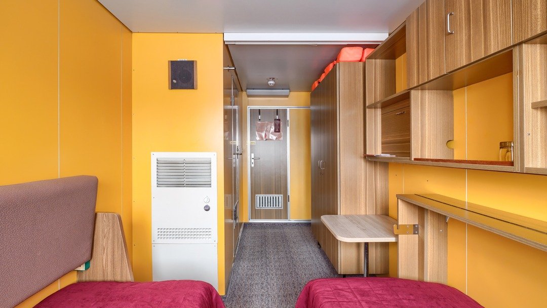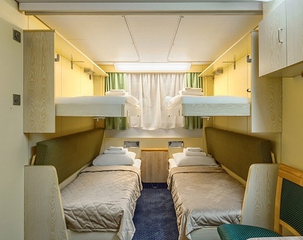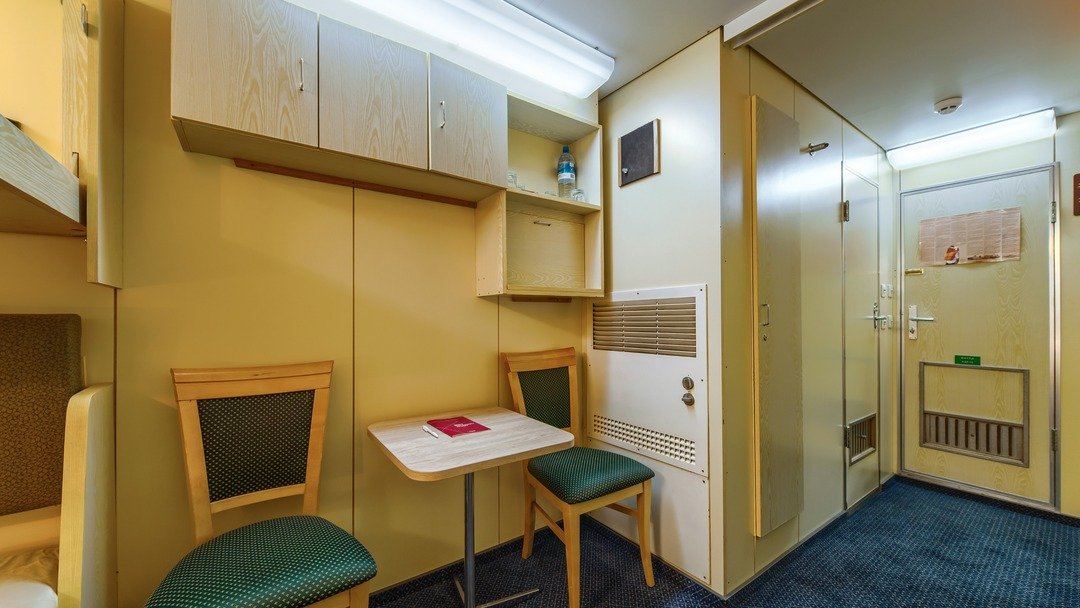 В каюте: четыре спальных места (два внизу, два вторым ярусом), шкаф для одежды, радио, душ, санузел, кондиционер, два иллюминатора, электророзетка на 220V. Площадь каюты - 12,81 кв.м.
