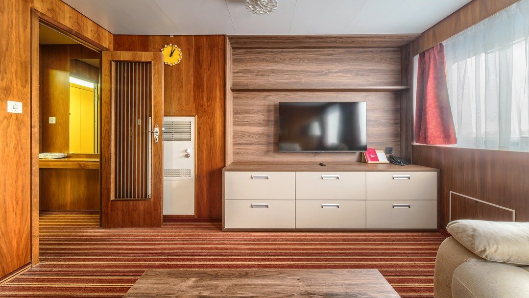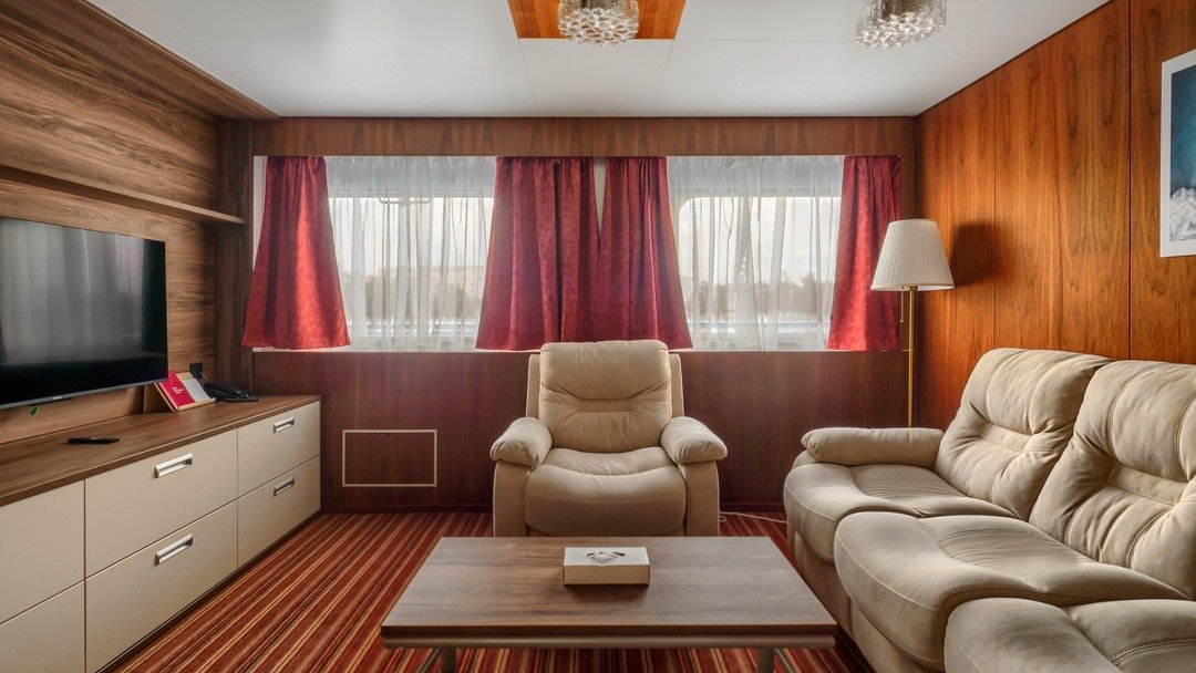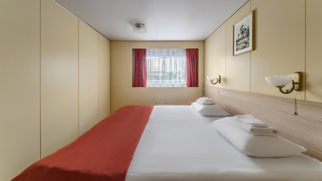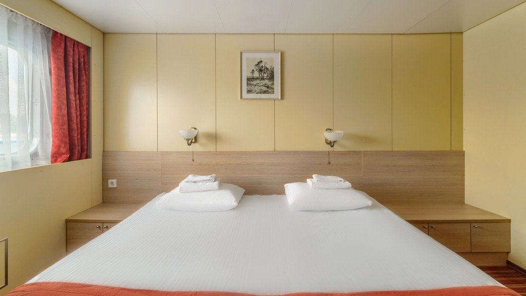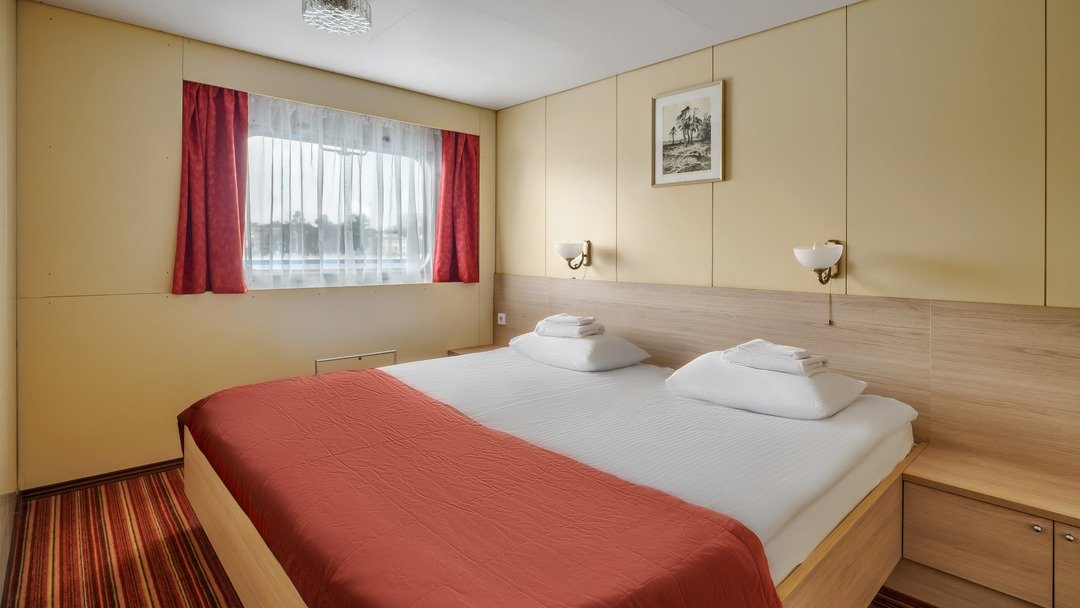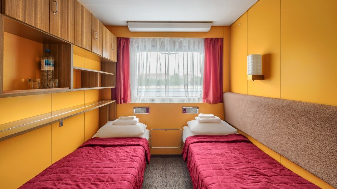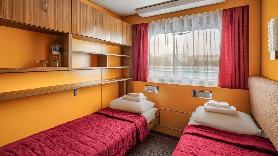 В каюте: два спальных места, шкаф для одежды, радио, душ, санузел, кондиционер, обзорное окно, электророзетка на 220V.