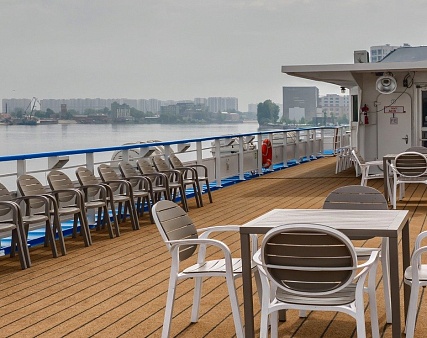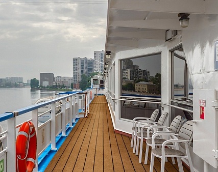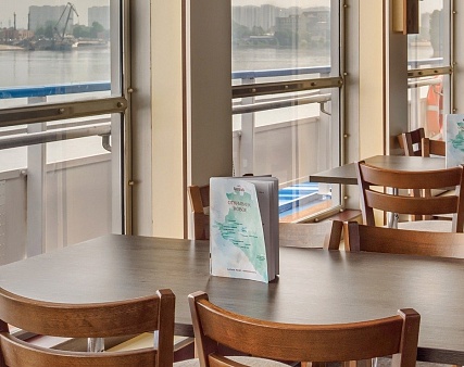 - Ужин — заказная система питания (выбор блюд со 2-го дня круиза). Включённые напитки (без ограничения): вода, чай, кофе, кисломолочный напиток (1 стакан 200 мл на ужин по запросу гостя). На выбор: вино красное / белое / игристое (1 бокал, 125 мл) / водка (1 рюмка, 50 мл) / пиво (1 бокал, 300 мл), домашний морс (1 бокал, 200 мл);