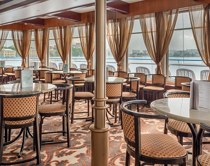- Ужин — заказная система питания (выбор блюд со 2-го дня круиза). Включённые напитки (без ограничения): вода, чай, кофе, кисломолочный напиток (1 стакан 200 мл. на ужин по запросу гостя).
