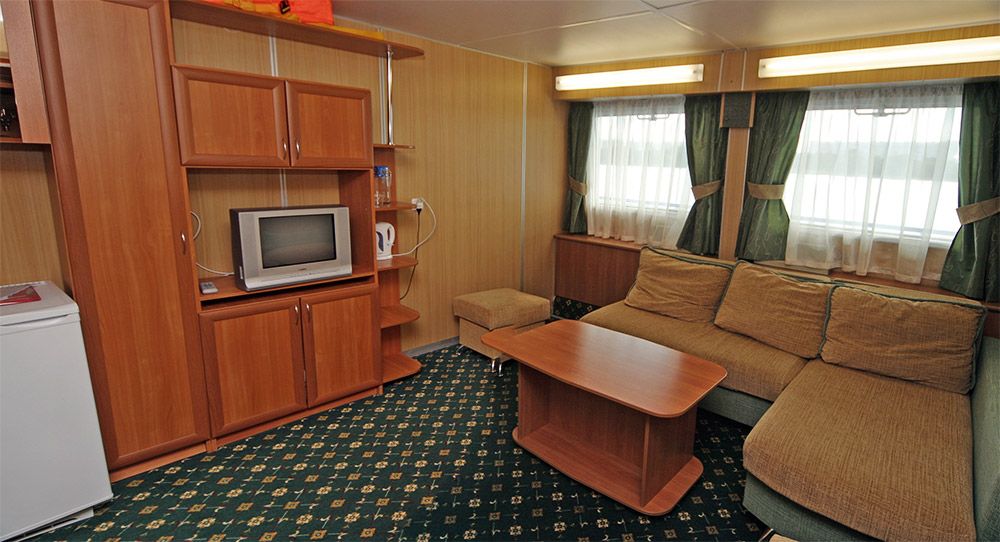 В каюте: два спальных места, шкаф для одежды, трюмо, радио, душ, санузел, кондиционер, обзорное окно, электророзетка на 220V.