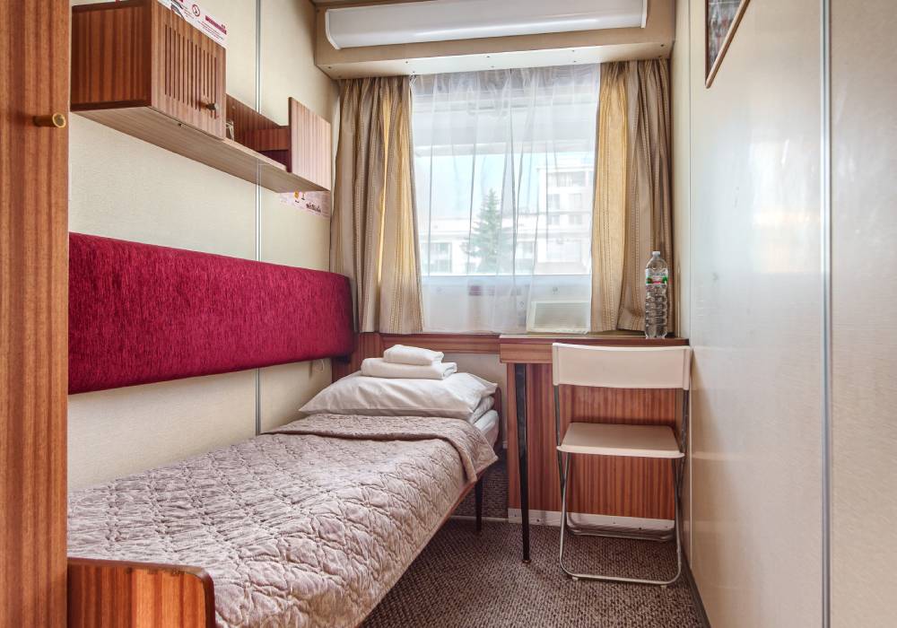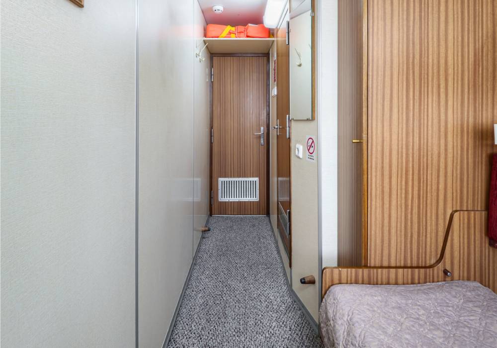 В каюте: одно спальное место, шкаф для одежды, зеркало, радио, душ, санузел, кондиционер, обзорное окно, электророзетка на 220V.
