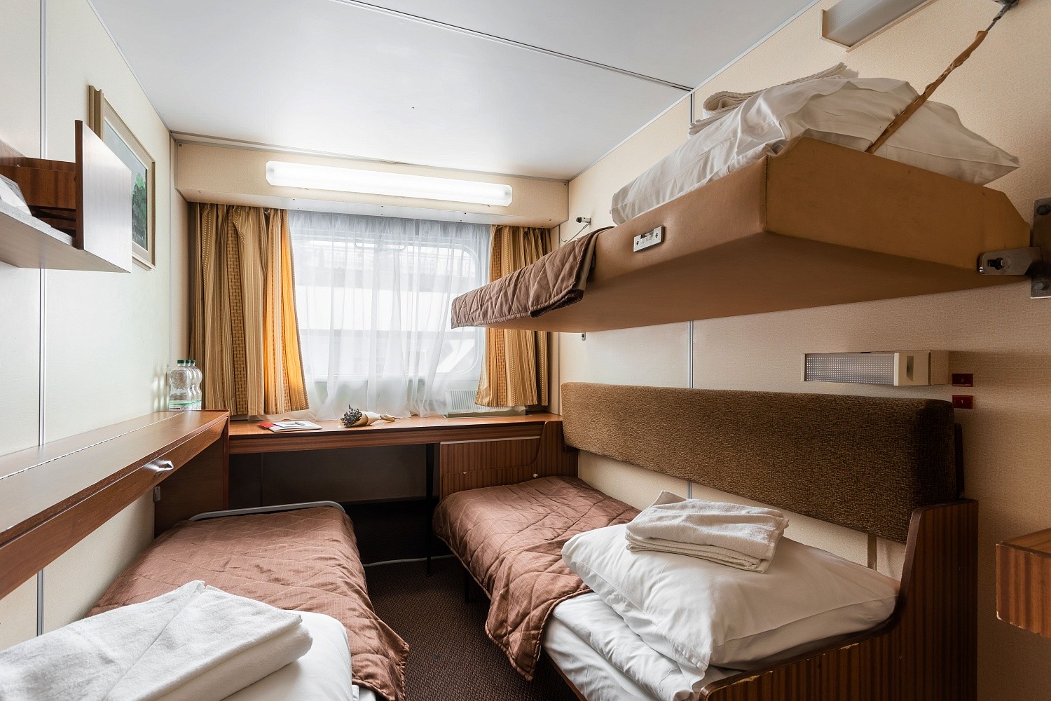 В каюте: три спальных места (два внизу, одно вторым ярусом), шкаф для одежды, трюмо, радио, душ, санузел, кондиционер, обзорное окно, электророзетка на 220V.
