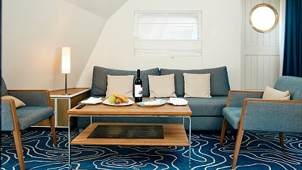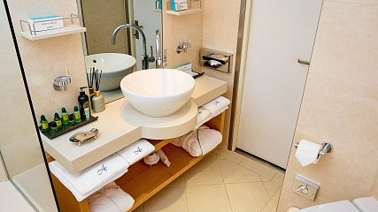 В каюте: кровать и диван (расположены буквой Г), кондиционер, гардероб, телевизор, телефон, фен, сейф, халаты, увлажнитель воздуха. Ванная комната с душем и туалетом.