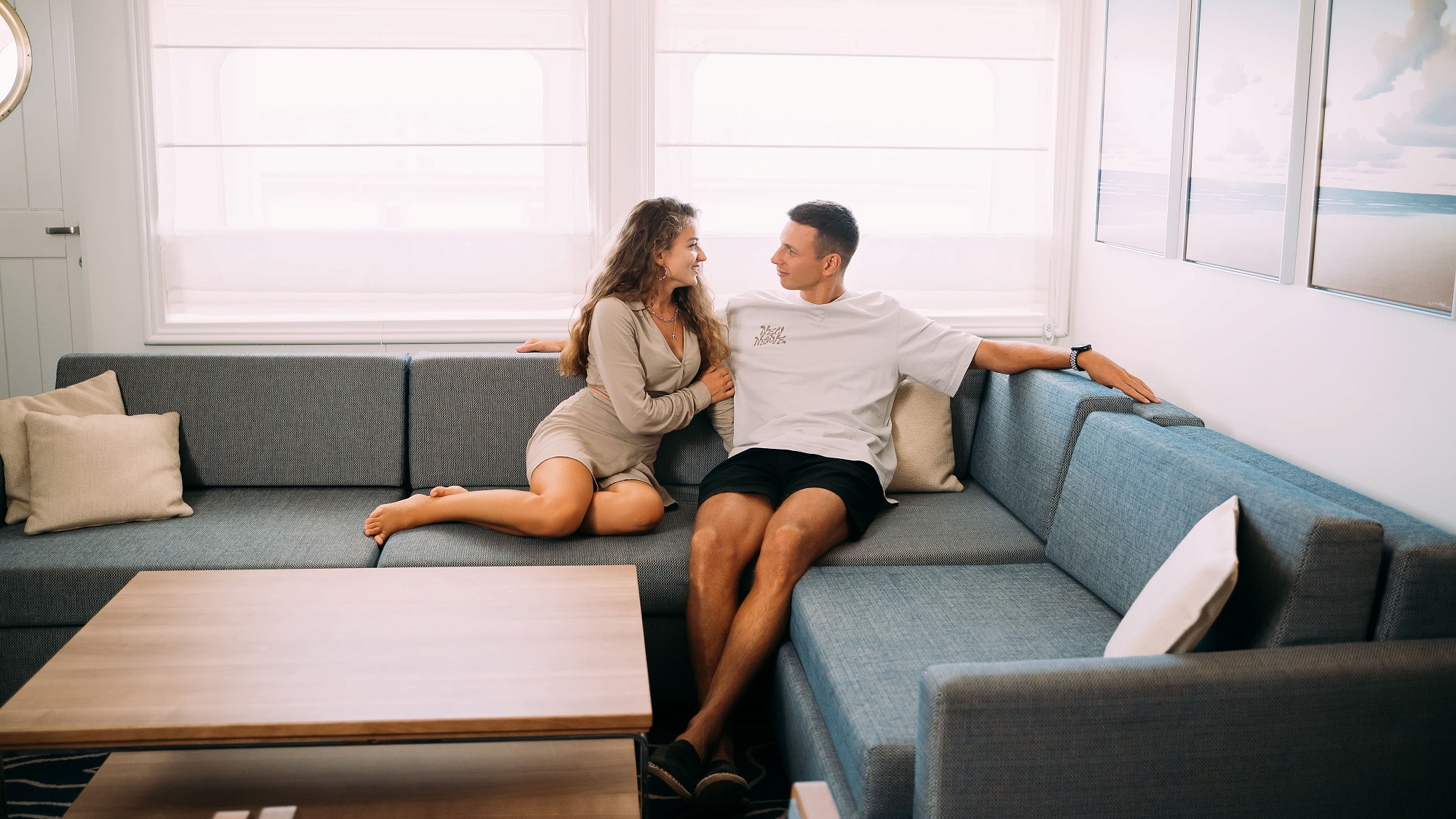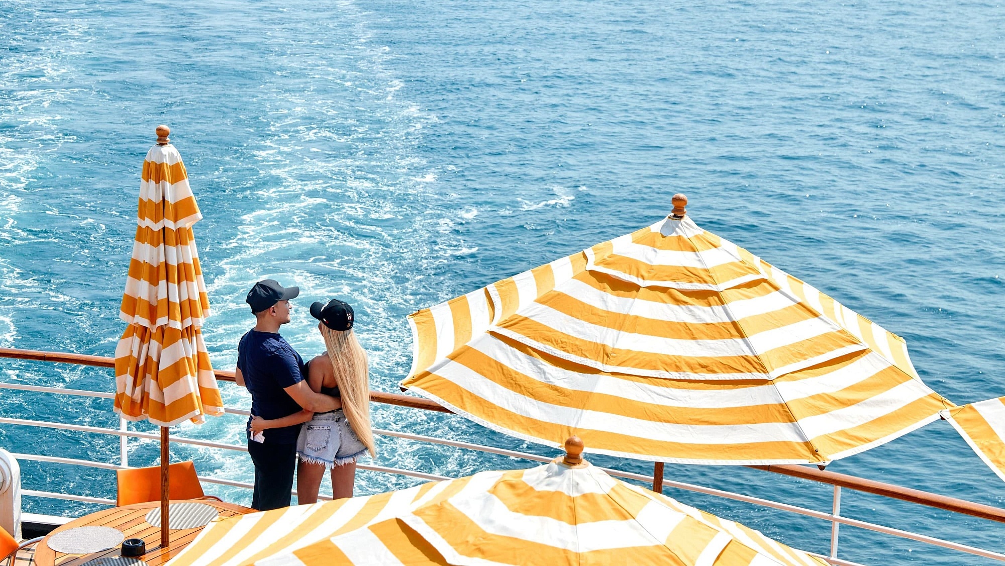 В каюте: частная палуба на 4 каюты, одна двуспальная кровать, диван, холодильник, кондиционер, гардероб, телевизор, телефон, фен, сейф, халаты, увлажнитель воздуха, кофемашина, чайник, персональный дворецкий. Ванная комната с ванной и туалетом.
