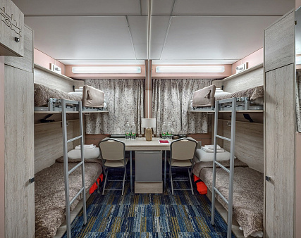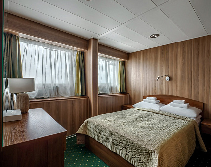 В каюте: четыре спальных места (два внизу, два вторым ярусом), шкаф для одежды, радио, душ, 2 санузла, холодильник, кондиционер, два обзорных окна, электророзетка 220V, фен.