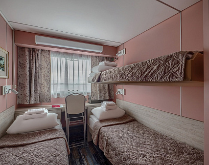 В каюте: три спальных места (два внизу, третье вторым ярусом), шкаф для одежды, радио, душ, санузел, кондиционер, обзорное окно, электророзетка 220V, фен.
