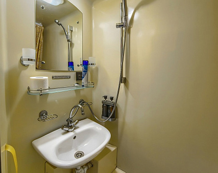 В каюте: три спальных места (два внизу, третье вторым ярусом), шкаф для одежды, радио, душ, санузел, кондиционер, обзорное окно, электророзетка 220V, фен.