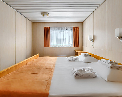 В каюте: одно спальное место, шкаф для одежды, холодильник, радио, душ, санузел, кондиционер, обзорное окно, электророзетка на 220V.