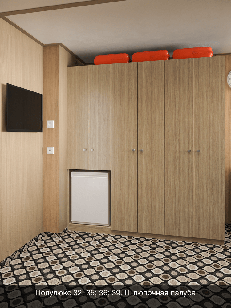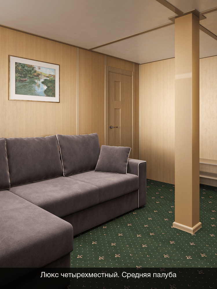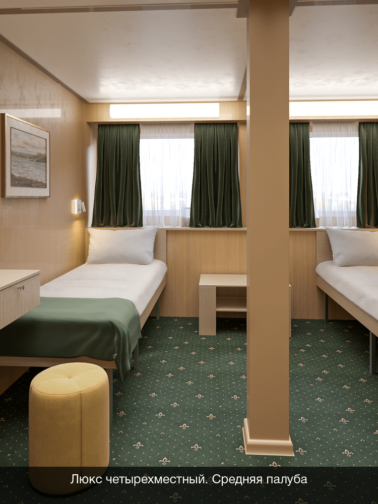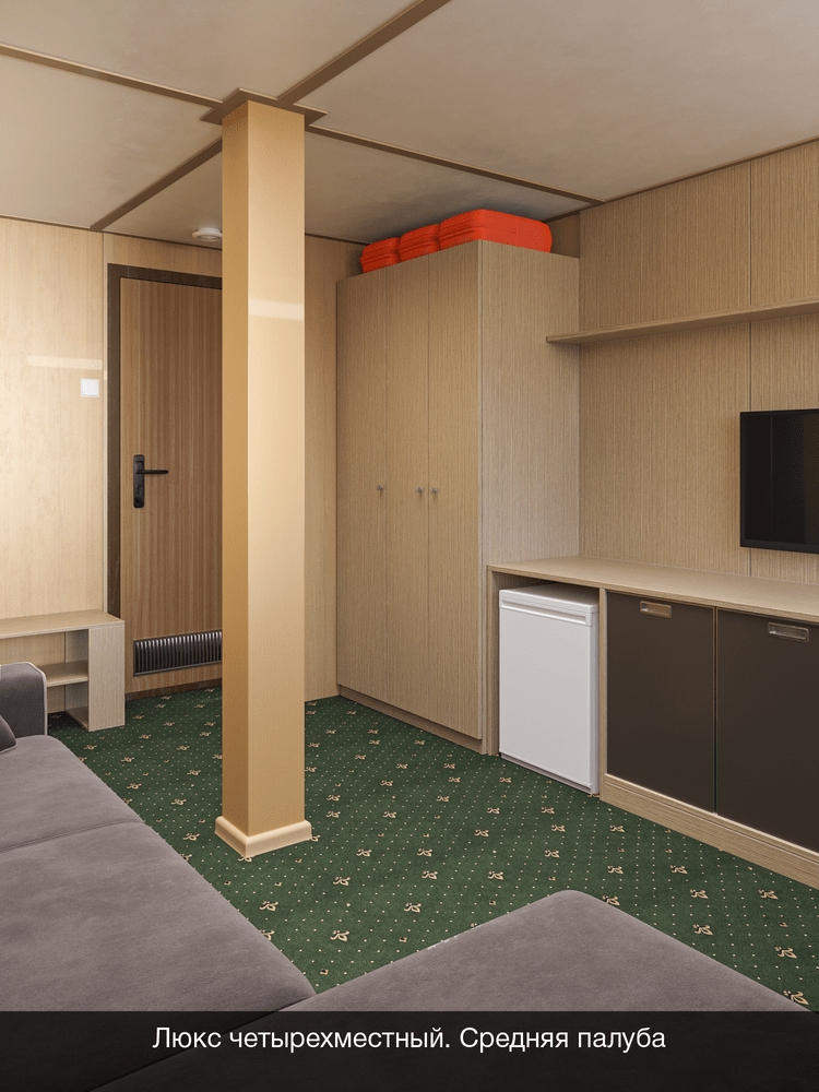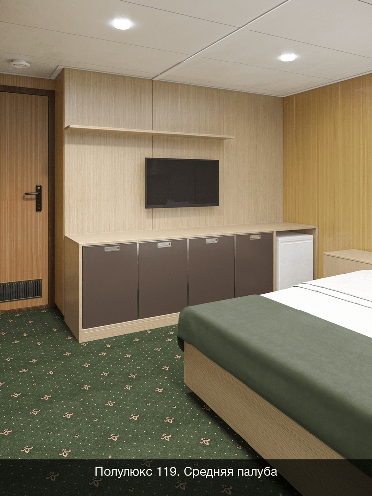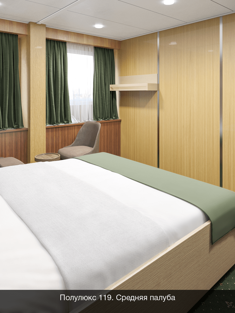 Двухкомнатный на средней палубе. Номер каюты: 119. Двухкомнатная каюта с удобствами (душ, санузел, кондиционер). Каюта рассчитана на размещение от двух до четырех человек. В гостиной: шкаф-стенка, двухспальная кровать, телевизор, холодильник, радио, фен, два обзорных окна, электророзетка на 220V. В спальне: два спальных места (одно над другим), зеркало.