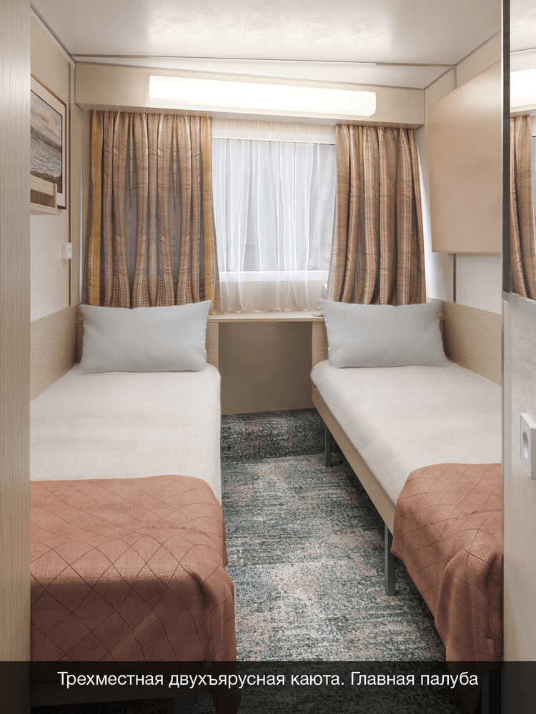 В каюте: три спальных места (два внизу, одно — вторым ярусом), шкаф для одежды, радио, зеркало, душ, санузел, кондиционер, обзорное окно, электророзетка на 220V.