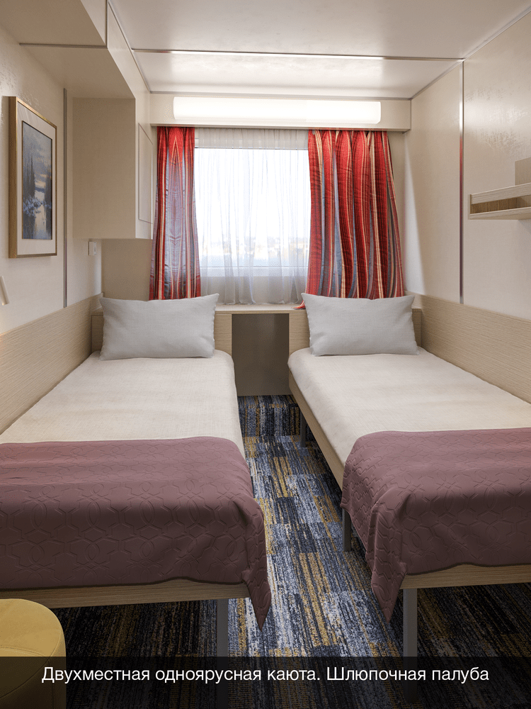 В каюте: два спальных места (одно над другим), шкаф для одежды, зеркало, радио, душ, санузел, кондиционер, обзорное окно, электророзетка на 220V.