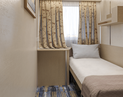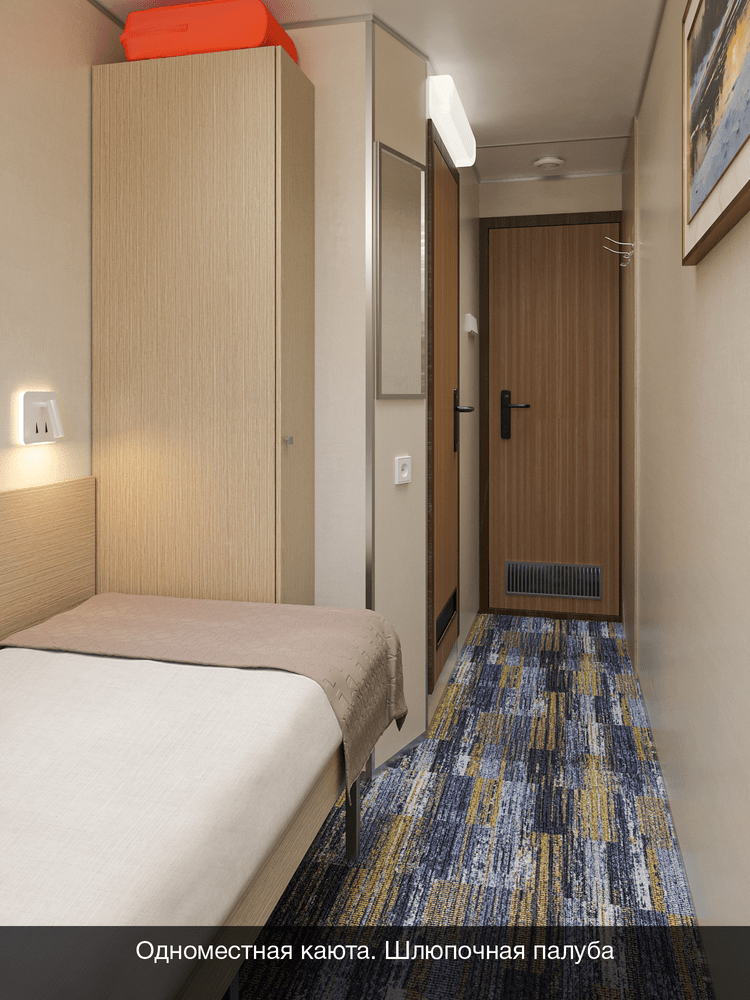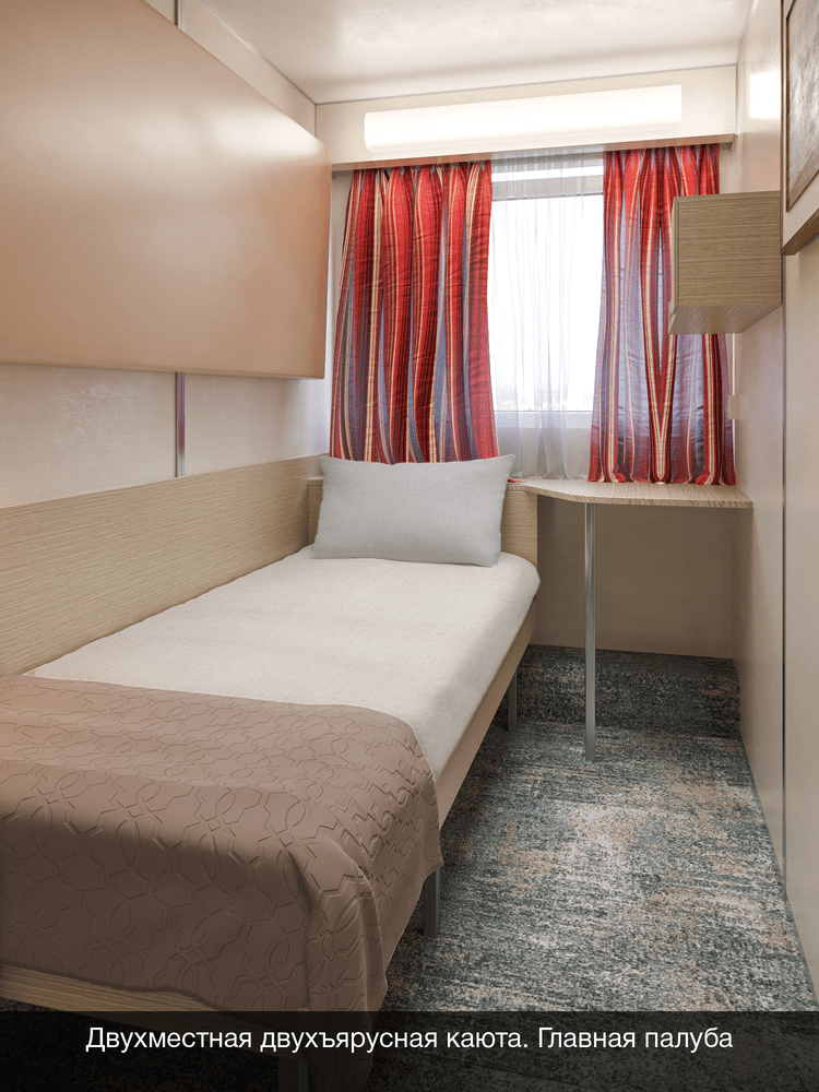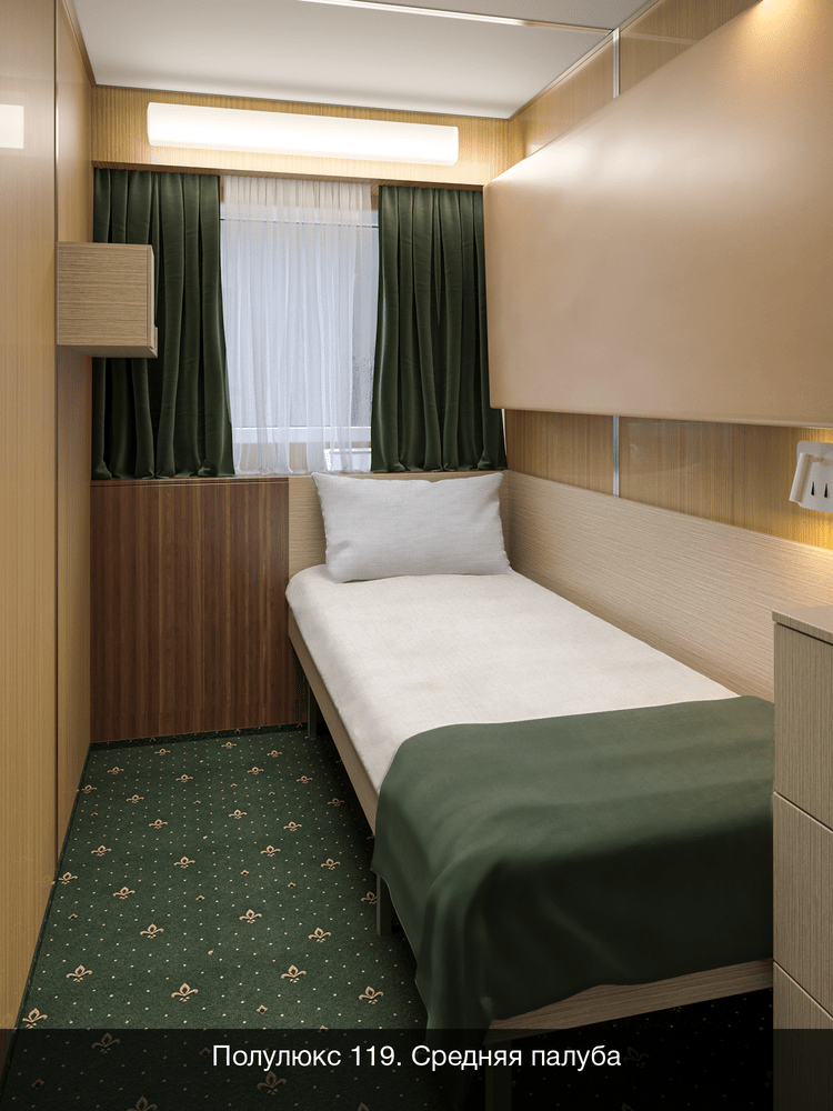 В каюте: одно спальное место, шкаф для одежды, радио, душ, санузел, кондиционер, обзорное окно, зеркало, электророзетка на 220V.