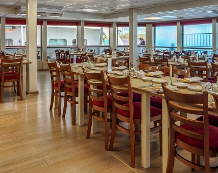 - Обед — заказная система питания (выбор блюд со 2-го дня круиза), фиксированная рассадка. Включённые напитки (без ограничения): вода, чай, кофе, морс;