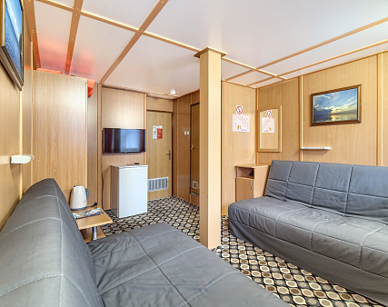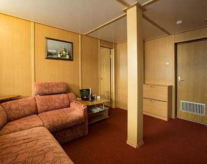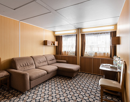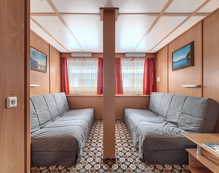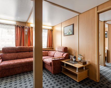 Двухкомнатный на средней палубе. Номер каюты: 119. Двухкомнатная каюта с удобствами (душ, санузел, кондиционер). Каюта рассчитана на размещение от двух до четырех человек. В гостиной: шкаф-стенка, диван, раскладывающийся на двоих, телевизор, холодильник, радио, фен, два обзорных окна, электророзетка на 220V. В спальне: два спальных места (одно над другим), зеркало.
