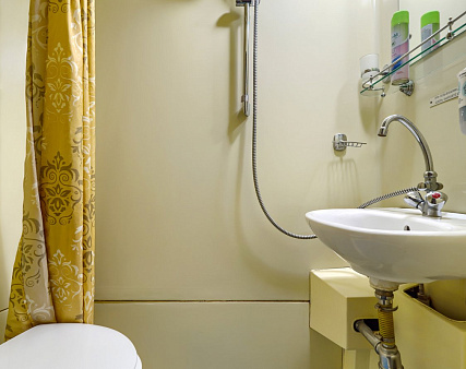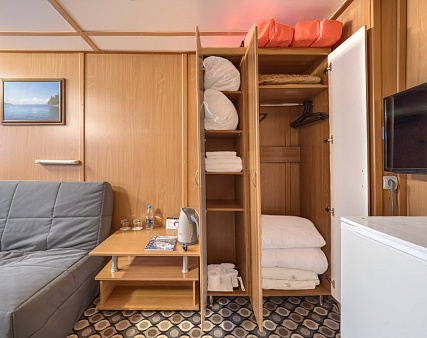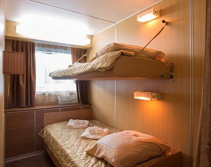 В каюте: три спальных места (два внизу, одно — вторым ярусом), шкаф для одежды, радио, зеркало, душ, санузел, кондиционер, обзорное окно, электророзетка на 220V.