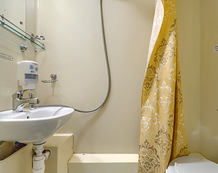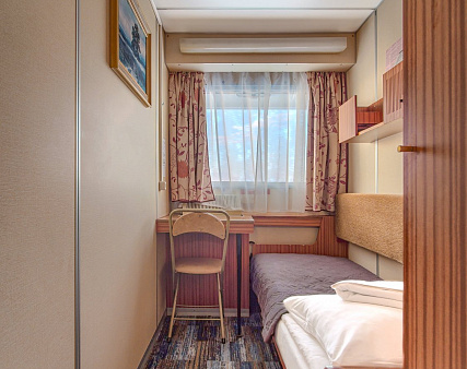 В каюте: одно спальное место, шкаф для одежды, радио, душ, санузел, кондиционер, обзорное окно, зеркало, электророзетка на 220V.