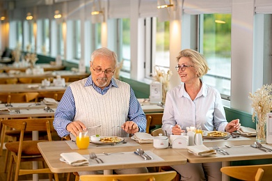 - Полный пансион (завтрак + обед + ужин): завтрак — шведский стол или заказная система с элементами шведского стола, фиксированная рассадка. Включённые напитки (без ограничения): вода*, сок, чай, кофе; обед — заказная система питания (выбор блюд со 2-го дня круиза), фиксированная рассадка. Включённые напитки (без ограничения): вода*, чай, кофе, морс (порционно); ужин — заказная система питания (выбор блюд со 2-го дня круиза), фиксированная рассадка. Включённые напитки (без ограничения): вода*, чай, кофе, кисломолочный продукт (1 стакан, 200 мл); порционно на выбор - вино красное / белое / игристое (1 бокал, 125 мл) / водка (1 рюмка, 50 мл) / пиво (1 бокал, 300 мл) / домашний морс (1 бокал, 200 мл).