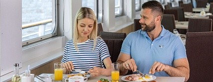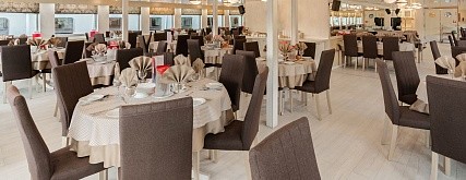- Полный пансион (завтрак + обед + ужин): завтрак — шведский стол или заказная система с элементами шведского стола, фиксированная рассадка. Включённые напитки (без ограничения): вода*, сок, чай, кофе; обед — заказная система питания (выбор блюд со 2-го дня круиза), фиксированная рассадка. Включённые напитки (без ограничения): вода*, чай, кофе, морс (порционно); ужин — заказная система питания (выбор блюд со 2-го дня круиза), фиксированная рассадка. Включённые напитки (без ограничения): вода*, чай, кофе, кисломолочный продукт (1 стакан, 200 мл); порционно на выбор - вино красное / белое / игристое (1 бокал, 125 мл) / водка (1 рюмка, 50 мл) / пиво (1 бокал, 300 мл) / домашний морс (1 бокал, 200 мл).