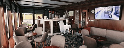 В каюте: одно спальное место, шкаф для одежды, радио, телевизор, холодильник, сейф, фен, душ, санузел, кондиционер, обзорное окно, электророзетка на 220V.