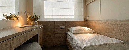 В каютах № 201-204 — одно спальное место, площадь каюты 7,7 м2
