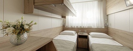 В каютах № 205,206,207,208 — две односпальные кровати размером 80х195см, которые можно сдвинуть. Площадь данных кают 16 м2.