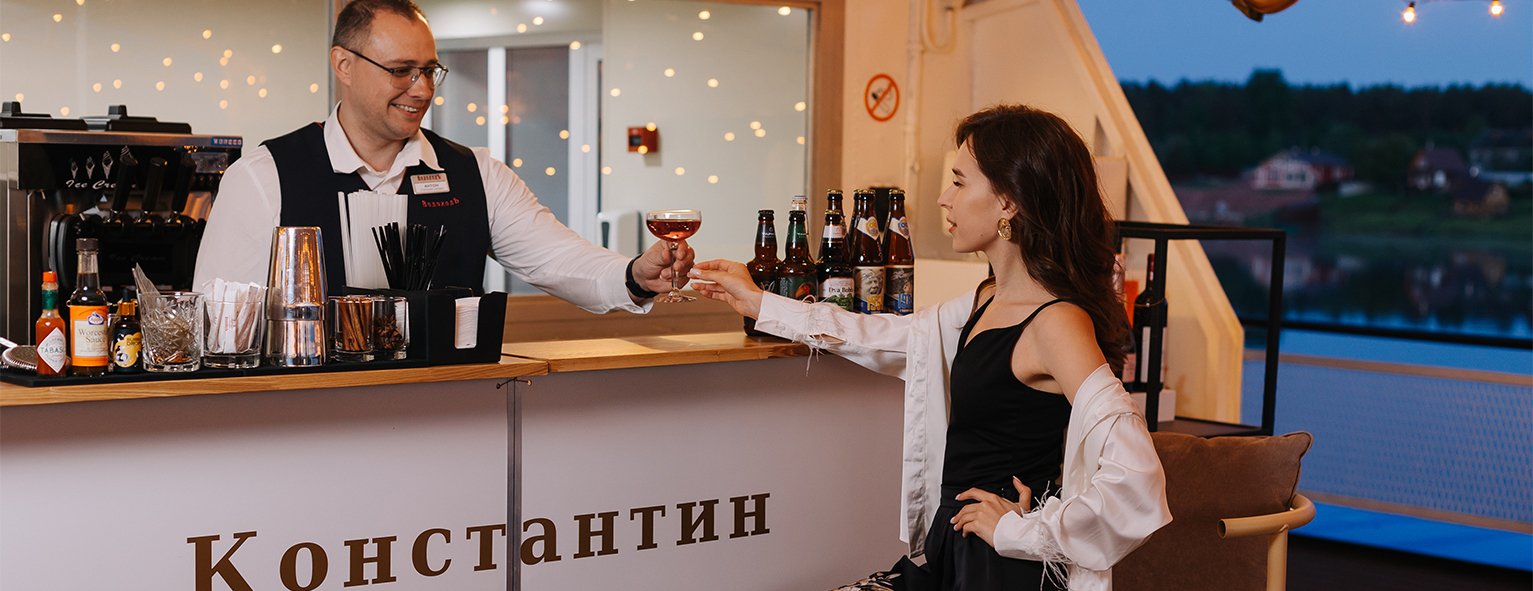 - Ужин – заказная система питания (выбор блюд со 2-го дня круиза), фиксированная рассадка. Включённые напитки (без ограничения): вода, чай, кофе. На выбор: вино красное / белое / игристое (1 бокал, 125 мл) / водка (1 рюмка, 50 мл) / пиво (1 бокал, 300 мл) / домашний морс (1 бокал, 200 мл). По запросу гостя: кисломолочный напиток (1 стакан, 200 мл).