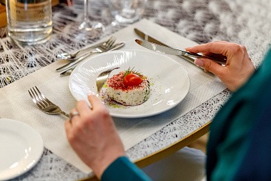 - Ужин — заказная система питания (выбор блюд со 2-го дня круиза). Включённые напитки (без ограничения): вода, чай, кофе, кисломолочный напиток (1 стакан 200 мл на ужин по запросу гостя). На выбор: вино красное / белое / игристое (1 бокал, 125 мл) / водка (1 рюмка, 50 мл) / пиво (1 бокал, 300 мл), домашний морс (1 бокал, 200 мл);