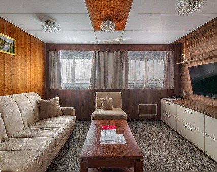 Двухкомнатная каюта с удобствами (душ, санузел, кондиционер). Каюта рассчитана на размещение от двух до четырех человек. В гостиной: мягкая мебель (раскладывающийся диван, кресло), шкафы для одежды, телевизор, холодильник, радио, мини-кухня, два обзорных окна, электророзетка на 220V. В спальне: двуспальная кровать, фен, обзорное окно.