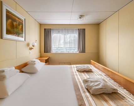 В каюте: четыре спальных места (два внизу, два вторым ярусом), шкаф для одежды, холодильник, телевизор, фен, радио, душ, санузел, кондиционер, два иллюминатора, электророзетка на 220V. Площадь каюты - 12,81 кв.м.
