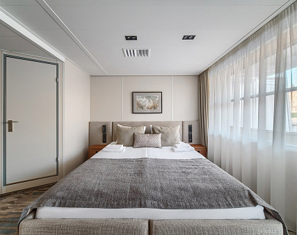 Комфортабельная комната с современным интерьером. Удобства: диван (раскладывается), телевизор, двуспальная кровать (кровати раздвигаются), прикроватные тумбы, письменный стол, холодильник, книжный стеллаж, журнальный столик, пуф, шкаф для одежды, 4 розетки на 220V, две розетки USB, фен. Балкон: два кресла, кофейный столик. Размер кровати — 175х210 см. В каюте возможно 3-местное размещение.