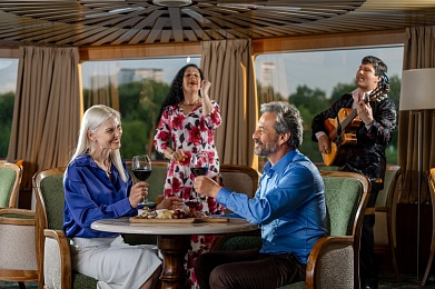 - Ужин – заказная система питания (выбор блюд со 2-го дня круиза), фиксированная рассадка. Включённые напитки (без ограничения): вода, чай, кофе. На выбор: вино красное / белое / игристое (1 бокал, 125 мл) / водка (1 рюмка, 50 мл) / пиво (1 бокал, 300 мл) / домашний морс (1 бокал, 200 мл). По запросу гостя: кисломолочный напиток (1 стакан, 200 мл).