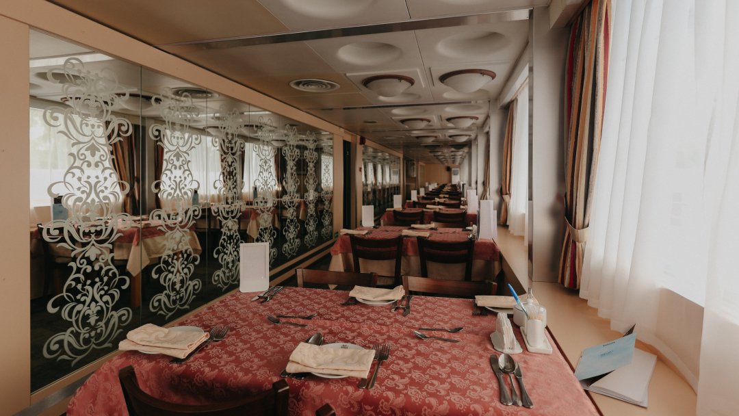 - Обед – заказная система питания (выбор блюд со 2-го дня круиза), фиксированная рассадка. Включённые напитки (без ограничения): вода, чай, кофе, морс.
