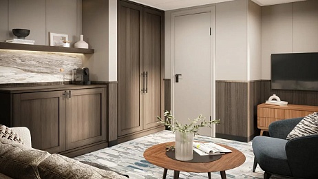 Комфортабельная гостиная с современным интерьером. Удобства: диван (раскладывается), кресло, журнальный столик, холодильник, телевизор, тумба, шкаф для одежды, прикроватные тумбы, 4 розетки на 220V, две розетки USB, фен. Балкон: два кресла, кофейный столик, два шезлонга. В спальне: двуспальная кровать (кровати раздвигаются), письменный стол, книжный стеллаж. В каюте возможно 4-местное размещение. Размер кровати —175х210 см. Размер дивана — 150х185 см.