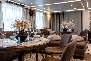На борту теплохода «Максим Горький» все сервисы и развлечения на борту продуманы так,чтобы максимально погрузить гостей в культуру и историю енисейского региона: от ресторанов с аутентичной местной кухней до сибирского банного комплекса с услугами СПА. Вы сможете «попробовать Сибирь на вкус» благодаря нашему уникальному меню, включающему сибирские специалитеты с авторскими решениями шеф-поваров.