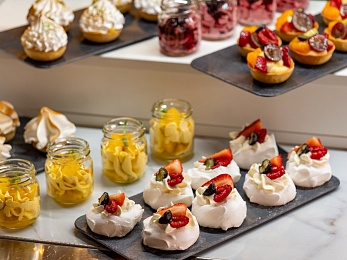 - Завтрак — шведский стол, фиксированная рассадка. Включённые напитки (без ограничения): вода, чай, кофе, сок, домашний морс.