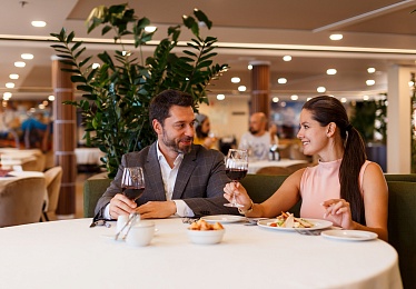 - Ужин — заказная система питания (выбор блюд со 2-го дня круиза), фиксированная рассадка. Включённые напитки (без ограничения): вода, чай, кофе, домашний морс. На выбор: вино красное / белое / игристое (1 бокал, 125 мл) / водка (1 рюмка 50 мл) / пиво (1 бокал, 300 мл).