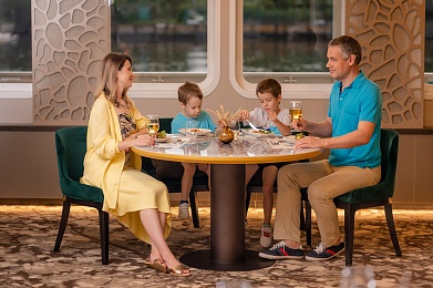 - Обед — заказная система питания (выбор блюд со 2-го дня круиза) с элементами шведского стола (десерт, фрукты, морсы), фиксированная рассадка. Включённые напитки (без ограничения): вода, чай, кофе, домашний морс;