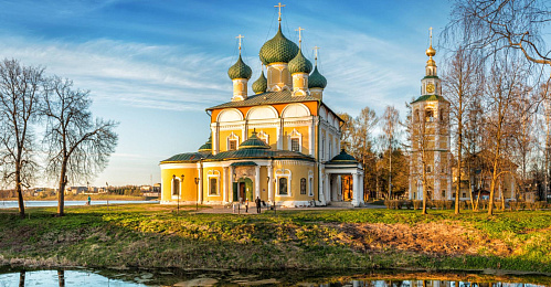 Углич – один из древнейших городов России, вошедший в Московское княжество в XIV веке. Здесь находится Кремль и церковь Царевича Дмитрия, в которой выставлена уникальная фреска XVIII века, рассказывающая о трагической гибели царского сына. Также интересен Спасо-Преображенский собор и Богоявленский монастырь.